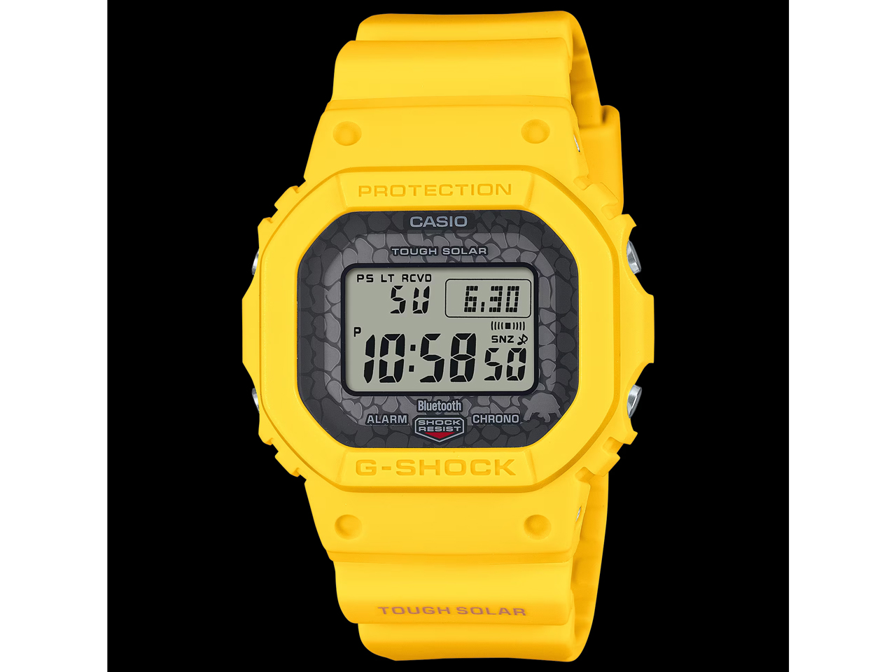 G-SHOCKチャールズ・ダーウィン財団コラボレーションのイエロー・モデルです。 ガラパゴス諸島で保全活動をしている、 チャールズ・ダーウィン財団とのコラボレーションモデルとのこと。 ベースは、電波ソーラーにBluetoothも備えた万能スクエアのGW-B5600。 このモデルをベースにしたコラボはめずらしいですね。 文字盤がブルーとグリーンの2モデルとカラーシリーズを形成しています。 同じカラーシリーズの他モデルと比べ、イエローのこのモデルはダントツに派手。 イエローはむかしからG-SHOCKの重要色ですが、 最近は意外にイエローのワントーンモデルが少ない。 豊富な機能を備えたカジュアルモデルとして一本持っていてもいいと思います。