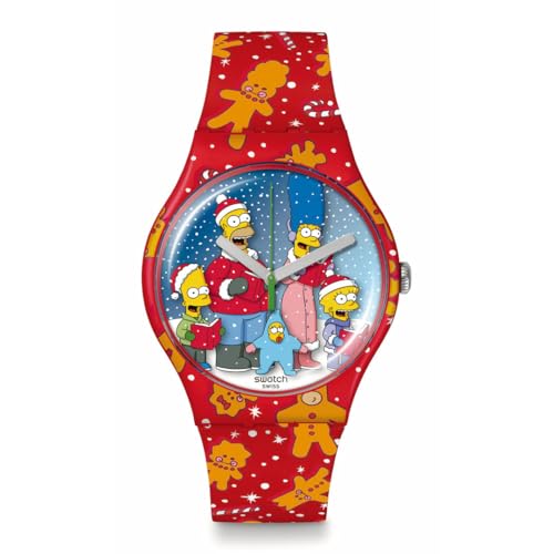 スウォッチの「The Simpsons」コレクション。 アメリカのテレビアニメ「The Simpsons(ザ・シンプソンズ)」のキャラクターがプリントされている。 WONDROUS WINTER WONDERLAND(SUOZ361)。 文字盤は雪が降る夜の風景にシンプソン一家全員が集合。 全員笑顔で家族の温かみを感じホッコリさせられるイラスト。 レッドのケース、ストラップもインパクトがある。 3針。 腕時計としての実用性よりも「The Simpsons」とのコラボグッズ的な要素が強め。 ケースサイズ41mm径(厚さ9.85mm)は賑やかなイラスト、インパクトがあるレッドカラーと相まって腕元での主張が激しい。 3気圧防水。 15,950円。