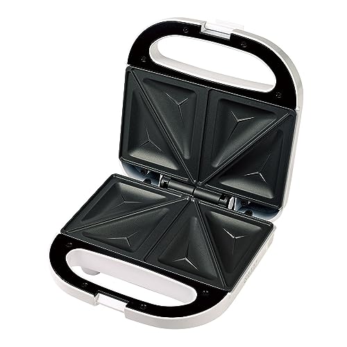食パン2枚同時、プレートデザインは食パンを 斜めに分けて3角形タイプに焼き上げますので 全体で一度に4個作れるプレートです。 プレートの深さがそこまで深くありませんので 具材は少なめなタイプになります。 特に三角形に分割する境界線上には入れない 様にしないと蓋が締めにくくなるので中が必要です。 加熱ランプぐらいしかないシンプルな製品。 1個1個小さめな可愛らしいホットサンドが 作れます。
