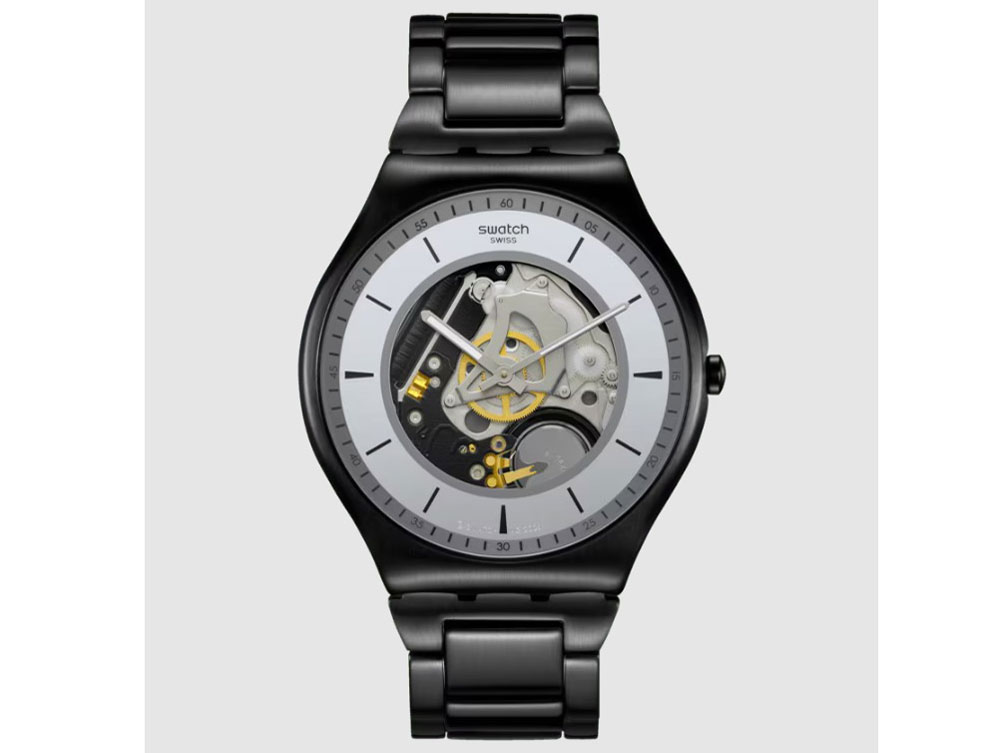 “カジュアルからフォーマルまで、どんな装いにも組み合わせられる時計”がコンセプトのSwatch ESSENTIALSの「TRAIN THE HANDS」。 2針のシンプルな機構ながら文字板中央がスケルトンになっておりクオーツメカが眺められる仕様。 内部メカと針が同系色で視認性は犠牲になっている。 ケース、ブレスレットはブラックPVDコーティングが施されたマットな質感。 ケースサイズは42.0mmとやや大きめだが厚みは6.7mmと薄型。 ホビー感、ツール感が強めでビジネスには使いにくい印象。 3気圧防水。 36,850円。