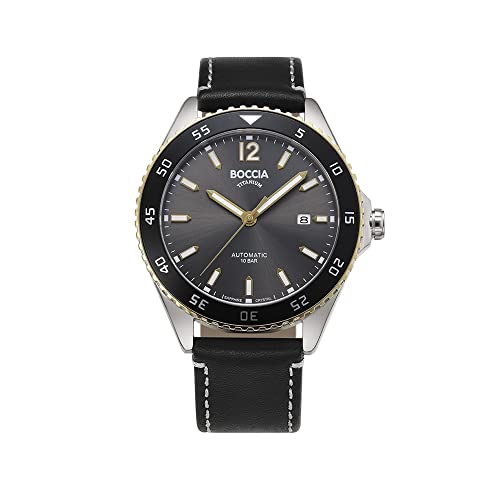 「BOCCIA TITANIUM(ボッチアチタニウム)」はドイツのウォッチメーカー チュチマ(Tutima)が立ち上げたアナザーブランド。 Classic Collection 3653-03。 ピュアチタニウムのケースにレザーベルトの仕様。 ダイバーズテイストのデザイン。 3針+デイト表示のシンプルな機構。 ブラックの文字盤はサンレイ仕上げで光の当たり方によって放射状の模様が変化して綺麗。 ペンシル型の時針と分針。 インデックスは12時はアラビア数字でそれ以外は先が尖ったバータイプ。 針、インデックスはシャープな印象。 針、インデックス縁はゴールドカラーでさり気ないゴージャス感あるアクセント。 ケース径は42mmでダイバーズテイストの時計としては良い存在感。 厚さ11mm。 ケースはチタニウム、レザーベルトで軽量。 自動巻ムーブメント搭載。 シースルーバック仕様でムーブメントを見られるが過度な装飾はない。 風防はサファイアクリスタル。 10気圧防水。 39,600円(税込)。