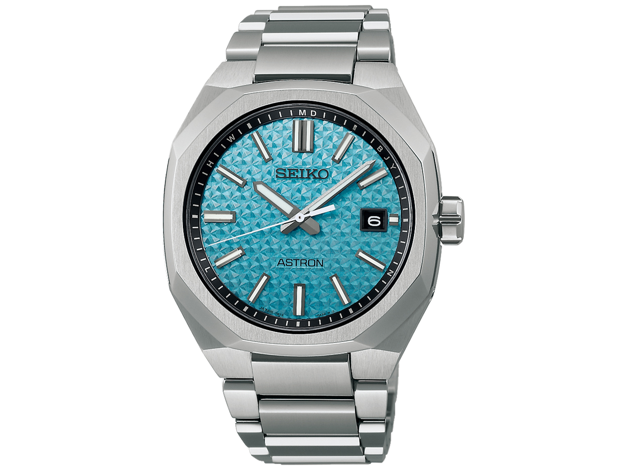 宇宙に瞬く星々を表現したダイヤルが特徴のNexter “Starry Sky” 2024 限定モデル。 4つのバリエーション。 SBXY079。 ネクスター八角形モデル(SBXY061、SBXY063)がベース。 澄んだ爽やかなライトブルーカラーの文字盤が鮮やか。 型打ちパターンで瞬く星空を表現しており光の当たり方によって表情が変わる。 シンプルな3針+日付表示で星空文字盤の美しさを邪魔しない。 ケース、ブレスレットに加えてベゼル部もチタンを採用しており全体的にソリッドな金属感。 エッジの効いた八角形ベゼルは緩やかな曲線が用いられゴツゴツした中でも柔らかさを兼ね備える。 バーインデックスは多面カットでよりシャープな印象。 ケースから3連ブレスへの繋がりはスムーズで洗練されたライン。 チタン外装により100gを切る軽さ(90g)。 ケース径は39.6mmで腕元で大きすぎない程良い存在感。 厚さは9.5mmに抑えられており袖口での収まりも良い。 ソーラー電波。 10気圧防水。 日本国内限定600本 裏蓋には「LIMITED EDITION」、「○○○/600」のシリアルナンバーが刻印されている。 中留はスマートアジャスター仕様で簡単にブレスレットの微調整ができる。 10気圧防水。 148,500円(税込)。