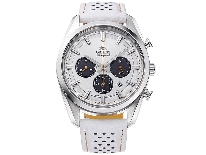 オリエントのコンテンポラリーシリーズのソーラー式クロノグラフ「クロノグラフ ソーラーパワード」。 2024年9月20日に6モデルが発売。 Contemporary RN-TX0308S。 ホワイトのレザーストラップを採用した限定モデル(国内200本)。 ホワイトにブラックのインダイヤルのパンダカラー文字盤。 ホワイトの文字盤は金属製で旧来のソーラーに見られたような樹脂感はない(受光部はインダイヤル)。 オレンジの針が良いアクセントになっている。 ケースサイズはクロノグラフとして程よい存在感を主張する40mm径(厚みは11.1mm)。 ホワイトのレザーストラップは清潔感がありパンチング穴がカジュアルでオレンジのステッチが可愛らしい。 ストラップは裏面のレバーで簡単に着脱できるイージークリック式でブラックのベルトに替えるとビジネスでも使いやすい装いになる。 41,800円(税込)。 手の届きやすい価格帯ながらキズが付きにくいサファイアガラス採用と実用性十分。 5気圧防水。