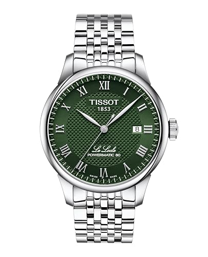 ティソのル・ロックル パワーマティック 80 T006.407.11.093.00。 グリーン文字盤。 木や森などの自然を想起させる目に優しいカラーで心が落ち着く。 ローマ数字インデックスがクラシカルな印象。 文字盤の中央と外周にギョシェパターンが施されておりさりげない高級感を感じる。 ケース径は39.3mmで3針デイトのシンプルな腕時計としては大きすぎず小さすぎずの絶妙なサイズ感。 厚さは9.75mmと薄型。 エレガントさも感じる多列ブレスレットは腕に馴染みやすい。 ブレスレットはクイックリリース式で取り外しが容易で革ベルトへの交換もしやすい。 こだわりが感じられるデザインのシースルーバックからは自動巻ムーブメントCal. 11 1/2'''を鑑賞できる。 パワーリザーブは80時間のロングリザーブ。 3気圧防水。 103,400円。 コスパ抜群のメカニカル。