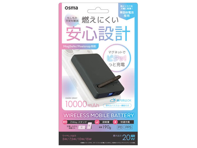 | 出力 | Type-C1/2(PD):5V/3A、9V/2.22A、12V/1.67A PPS:5V-5.9V/3A、5V-11V/2A Wireless:5W、7.5W、10W、15W |