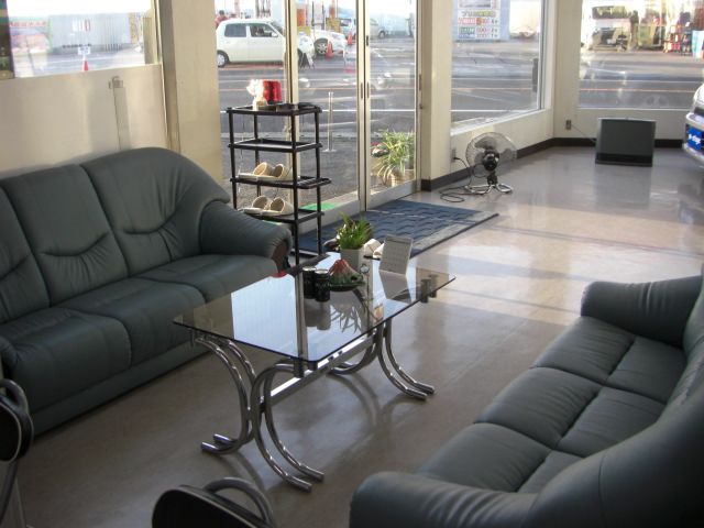 当店のショールームです。 このソファーで5.1chのシアターサウンドを満喫していただけます。 店内にも車輌を展示しておりますので、ゆっくりとコーヒーでも飲みながら 車選びをしていただけます。