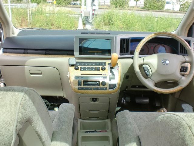 エルグランド 純正メモリーナビ、地デジフルセグTV、Bluetoothオーディオ、バックモニター、フリップダウンモニター、両側パワースライドドア、インテリジェントキー、ETC、寒冷地仕様車