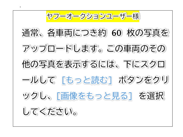 ご覧頂きありがとうございます。 ■この車への「お問合せ」・「無料見積り依頼」、「在庫確認」は、お気軽にどうぞ! ■この車両以外にも「車選びドットコム」におすすめの中古車を掲載しております。 他の在庫車種、お店へのアクセスは【販売店情報ページ】をご覧ください。 店頭商談中・売約済の場合もありますので、ご来店の際は事前にお問合せ頂き、該当車両の有無をご確認ください。 提供サービス内容 ★ 車両のみの販売 ★ 予備検査付き販売 ★ 総額販売の対応 ★ 買取および下取りも歓迎 _____________________________________ 追加の特典とサービス ★ 現車確認対応 お電話で事前予約いただければ、現車をご確認いただけます。 ★ ヤフオク未経験者サポート ヤフーIDをお持ちでない方や入札に不安がある方もお電話でサポート可能です。 _____________________________________ 車両状態について 外装・内装 ★ 車両の年式に応じて、多少の汚れや小さ…