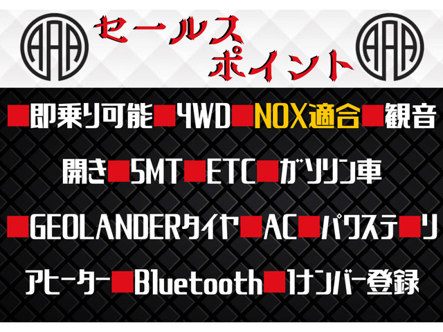 ★ご高覧頂きありがとうございます!★ ■即乗り可能 ■4WD ■NOX適合 ■観音開き ■5速マニュアル ■ETC ■ガソリン車 ■GEOLANDERタイヤ ■エアコン ■パワステ ■リアヒーター ■Bluetooth ■1ナンバー登録 ★走行無制限12ヶ月無料保証付 *保証費用は本体価格に含まれています。 保証詳細★下記は不具合ではありません。保証内容になります★ 『*警告チェックランプ常時点灯(エンジン警告灯・ABS警告灯・油圧警告灯・充電警告灯・水温計警告灯・ミッション警告灯・ハイブリッドシステム警告灯) ・ドアミラー・バンパー・ライトレンズ・ガラスの損壊。 *修理見積金額の5万円もしくは10万円まで保証致します。一年契約で更新出来ます。 *保証加入には一定の条件を満たす必要があります。』 ★落札価格には車両消費税が含まれておりますので、追加の費用は発生しません! ★諸費用の合計 *諸費用の合計は最大限のものとなっております。(納車費用、遠隔地…