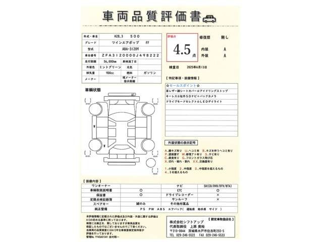 500S ツインエア 1オーナー 走行6.0万km ETC 半革 禁煙 記録簿 評価4.5点