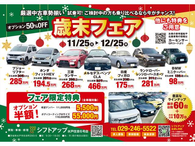 【★歳末フェア開催中!!★】 ○全車特別価格! ○オプション50%OFF! ※詳細はお問合せ下さい。 厳選中古車勢揃い!試乗可!ご検討の方も乗り比べるなら今がチャンス! ★開催期間:11/25〜12/25 -----------------------------------------------------------…