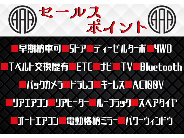 ★ご高覧頂きありがとうございます!★ ■早期納車可 ■5ドア ■ディーゼルターボ ■4WD ■Tベルト交換歴有 ■ETC ■ナビ ■TV ■Bluetooth ■バックカメラ ■ドラレコ ■キーレス ■AC100V ■リアエアコン ■リアヒーター ■ルーフラック ■スペアタイヤ ■オートエアコン ■電動格納ミラー ■パワーウィンドウ ★走行無制限12ヶ月無料保証付 *保証費用は本体価格に含まれています。 保証詳細★下記は不具合ではありません。保証内容になります★ 『*警告チェックランプ常時点灯(エンジン警告灯・ABS警告灯・油圧警告灯・充電警告灯・水温計警告灯・ミッション警告灯・ハイブリッドシステム警告灯) ・ドアミラー・バンパー・ライトレンズ・ガラスの損壊。 *修理見積金額の5万円もしくは10万円まで保証致します。一年契約で更新出来ます。 *保証加入には一定の条件を満たす必要があります。』 ★落札価格には車両消費税が含まれておりますので、追加の費用…
