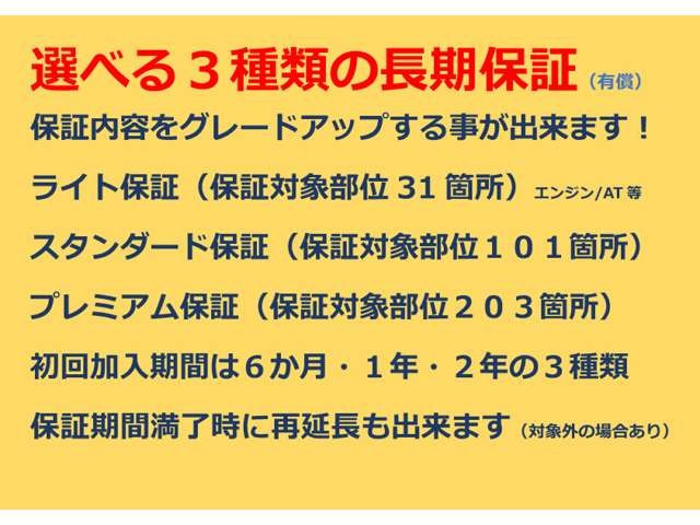 保証が付いています。車両価格には購入後の保証費用が含まれており、保証書が交付されます。保証条件や内容は販売店によって異なりますので、詳しくは各販売店へお問い合わせください。