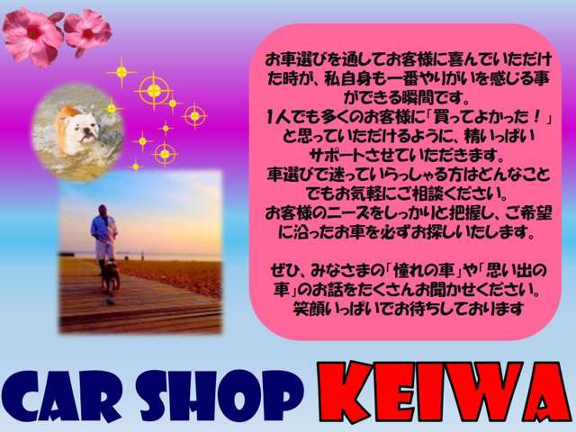 はじめまして。カーショップ恵和の代表の藤浦です。 お客様のご要望を第一に考えることをモットーに、お客様にとって『ぴったりの一台』となるお車をご提案させていただきます。お車選びを通してお客様に喜んでいただけた時が、私自身も一番やりがいを感じ…