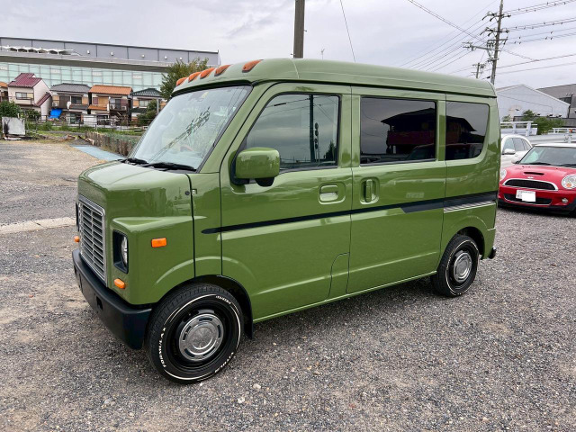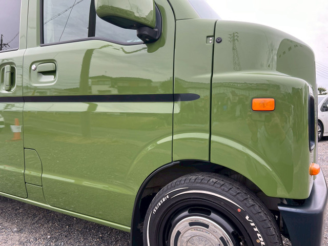 スタイリッシュなグリーンにオールペイントされた一台です。修復歴なしで、安心してお乗りいただけます。特にカスタムが魅力で、外装カスタムに加え、14インチホワイトレタータイヤ、ナルディーステアリング、7インチナビやルーフマーカーも装備。フロントドライブレコーダーもついていて安心です。さらに、ETCやバックカメラを備え、日々のドライブを快適にサポートします。たばこ臭もなしのクリーンな内装です。