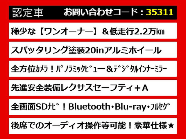 [上級グレード LS500h バージョンL]<br><br><br>[稀少ワンオーナー!]<br><br>[低走行2.2万キロ]<br><br>[デジタルインナーミラ―]<br>車後方のカメラからリアルタイムで情報をインナーミラーに映し出してくれる機能になります!後席に荷物をたくさん積んだとしても後ろの状況が把握できるので非常に便利な機能になっております!<br><br>[スパッタリング塗装20インチアルミホイール]<br>新車時オプション16万円!<br><br>[パノラミックビュー搭載!]<br>前後左右にカメラが搭載されており、周囲の状況を真上から見下ろすような形でナビ画面に映し出されます!周囲に障害物がある時や、駐車時に役立つ機能になっておりま<br><br>[パワートランク]<br>小柄な方でも開け閉めが簡単で力を使わずにトランクを開け閉めができるので<br>安心・便利です!<br><br>[先進安全装備レクサスセーフティ+A搭載]<br><br>・レーダークルーズコントロール<br>・プリクラッシュセーフ…