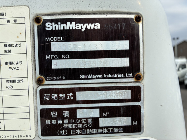 ご覧頂きありがとうございます。 ■この車への「お問合せ」・「無料見積り依頼」、「在庫確認」は、お気軽にどうぞ! ■この車両以外にも「車選びドットコム」におすすめの中古車を掲載しております。 他の在庫車種、お店へのアクセスは【販売店情報ページ】をご覧ください。 問合わせ・来店の際には「中古車情報サイト(車選びドットコム)を見た」とお伝えください。 店頭商談中・売約済の場合もありますので、ご来店の際は事前にお問合せ頂き、該当車両の有無をご確認ください。 ☆新明和工業製ボデー ☆GR052モデル ☆5立米 ☆連続スイッチ ☆回転板式 ☆汚水タンク ☆速単切替有 ☆最大積載量2000kg ☆5速マニュアル ☆4M50エンジン スタッフ一同、お客様からのお問合せをお待ちしております。