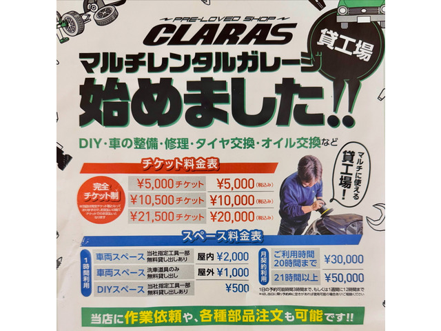 【PRE-LOVED SHOP CLARAS】 札幌市手稲区に2025年8月オープン!! 車関係、工場設備、住宅なんでもご相談ください! 弊社工場ではレンタルガレージも併設♪ 車両の軽整備や洗車やコーティングご自分でやってみませんか? お気軽にお問合せください!