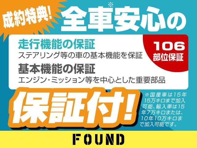保証が付いています。車両価格には購入後の保証費用が含まれており、保証書が交付されます。保証条件や内容は販売店によって異なりますので、詳しくは各販売店へお問い合わせください。