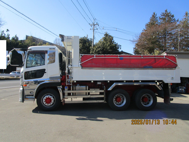クオン Lゲートダンプ 電動コボレーン バイザー アルミタンク F6速 ターボ車両総重量:19,940kg 大型免許対応走行距離:733,033km 燃料:軽油 8t積載
