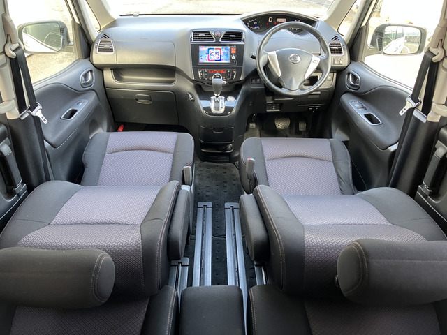 セレナ ハイウェイスター 禁煙車・ディスチャードランプ・フロントフォグランプ・3列シート・フルフラットシート・ウォークスルー・地デジ対応ナビ・後部座席エアコン・インテリキー・社外ナビ・純正ホイール