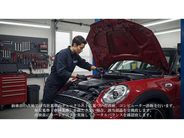 販売店が納車(展示)時までに定期点検整備(自家用乗用車の場合は、法定12ヵ月点検整備または法定24ヵ月点検整備)を実施します。