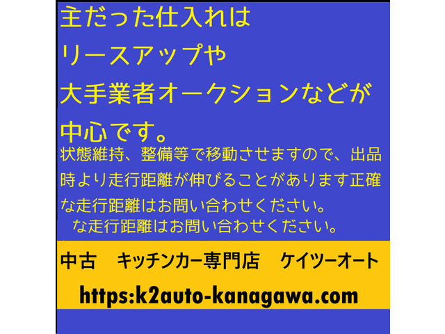 日産 アトラスは平成26年式のブルーのトラックで、63,270kmの走行距離*2です。 この車両は修復歴なし、保証付き*1で安心してご利用いただけます。 特にキッチンカーとして最適で、作業台や跳ね上げ販売口サッシ窓、電源コンセント、レール電源を完備。 これ一台で移動販売の新たなスタートを切れる、あなたのビジネスの力強いパートナーです。ETC装備付きでお得です。ぜひお問い合わせください。 一時抹消渡し、予備検査及び加工予備検査は応談別途費用 ★本車両は現状販売車両です。 主だった仕入れはリースアップや大手業者オークションなどが中心です。 格安で販売させて頂くために本車両は未整備状態で販売させて頂いております。 整備等をご希望のお客様はお問い合わせください。 車両仕入時に50kmほど自走にて走行しましたが、走る、曲がる、止まる では異常ありませんでしたが 全ての機能が正常であるかを確認できておりません。 ★諸費用込の内容…