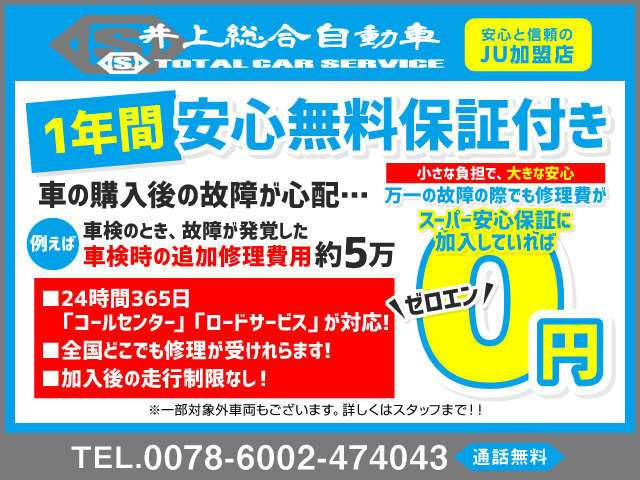 保証が付いています。車両価格には購入後の保証費用が含まれており、保証書が交付されます。保証条件や内容は販売店によって異なりますので、詳しくは各販売店へお問い合わせください。