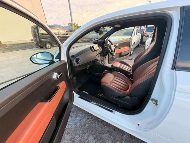 アバルト595 ツーリズモ 1オーナー 禁煙車 後期モデル アイスホワイト 165PS パドルシフト TFT液晶 純正17AW 茶革 2DINナビ フルセグ ETC アルミペダル