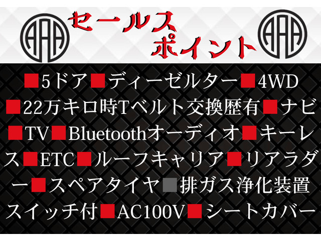 ★ご高覧頂きありがとうございます!★ ■5ドア ■ディーゼルターボ ■4WD ■22万キロ時Tベルト交換歴有 ■ナビ ■TV ■Bluetoothオーディオ ■キーレス ■ETC ■ルーフキャリア ■リアラダー ■スペアタイヤ ■排ガス浄化装置スイッチ付 ■AC100V ■シートカバー ■リアヒーター ■リアAC ★走行無制限12ヶ月無料保証付 *保証費用は本体価格に含まれています。 保証詳細★下記は不具合ではありません。保証内容になります★ 『*警告チェックランプ常時点灯(エンジン警告灯・ABS警告灯・油圧警告灯・充電警告灯・水温計警告灯・ミッション警告灯・ハイブリッドシステム警告灯) ・ドアミラー・バンパー・ライトレンズ・ガラスの損壊。 *修理見積金額の5万円もしくは10万円まで保証致します。一年契約で更新出来ます。 *保証加入には一定の条件を満たす必要があります。』 ★落札価格には車両消費税が含まれておりますので、追加の費用は発生しません! ★…