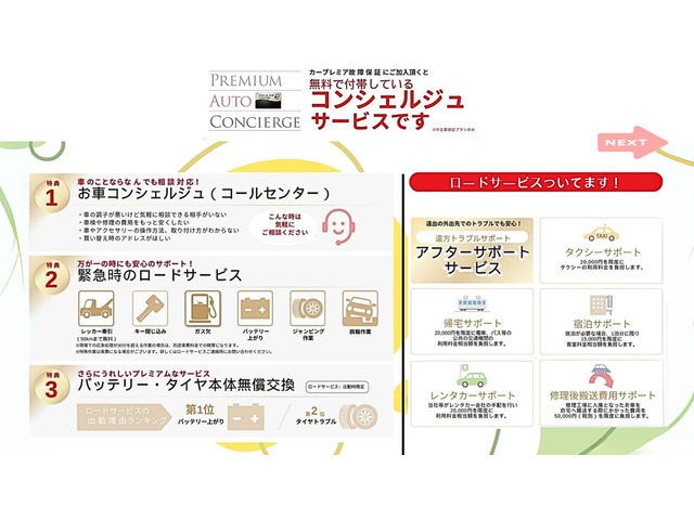 保証が付いています。車両価格には購入後の保証費用が含まれており、保証書が交付されます。保証条件や内容は販売店によって異なりますので、詳しくは各販売店へお問い合わせください。