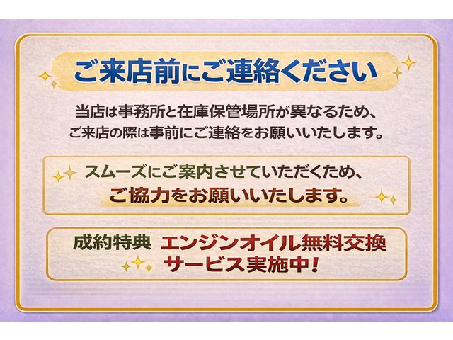 ご覧頂きありがとうございます。 ■この車への「お問合せ」・「無料見積り依頼」、「在庫確認」は、お気軽にどうぞ! ■この車両以外にも「車選びドットコム」におすすめの中古車を掲載しております。 他の在庫車種、お店へのアクセスは【販売店情報ページ】をご覧ください。 問合わせ・来店の際には「中古車情報サイト(車選びドットコム)を見た」とお伝えください。 店頭商談中・売約済の場合もありますので、ご来店の際は事前にお問合せ頂き、該当車両の有無をご確認ください。 スタッフ一同、お客様からのお問合せをお待ちしております。