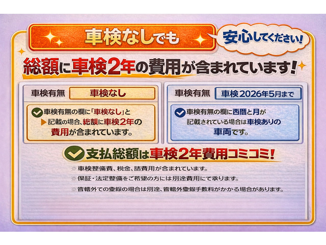 車両価格には定期点検整備に必要な費用が含まれており、点検整備記録簿が交付されます。詳しくは各販売店へお問い合わせください。