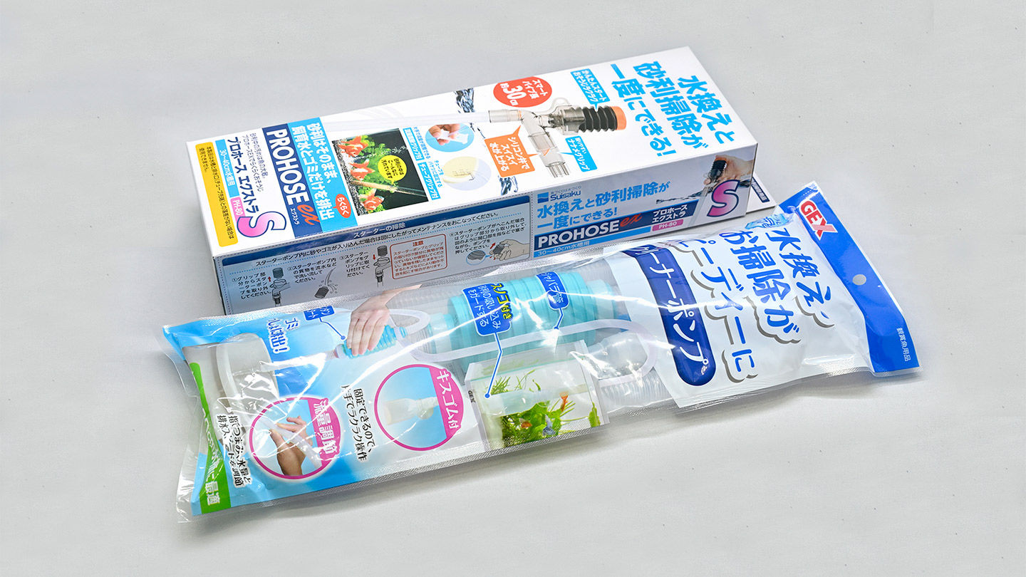 各アクアリウムメーカーからさまざまなタイプの水換え用ホースが販売されています。水槽の大きさなどに応じて、使いやすい商品を選びましょう。