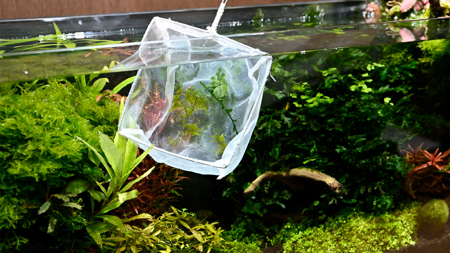 水槽内に水草の欠片やゴミが漂っていると見た目が悪いだけでなく、水質の悪化にもつながってしまいます。水槽の近くに目の細かいネットを常備し、こまめにすくって除去しましょう。