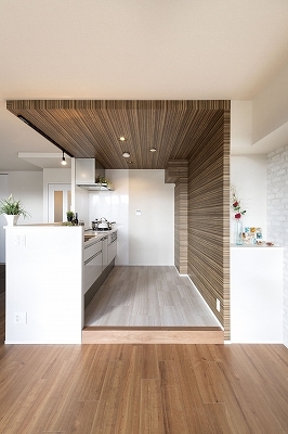 キッチンの天井・壁に木目でアクセントを付けることで、開放的なキッチンだけれどステージのような空間とし、特別感を演出しました。