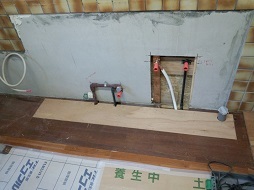既設の流し台は壁出し水栓だったので、新しく床をめくって水栓金具と食洗機の配管を一緒に行いました。換気扇は、以前はレンジに対し横壁に開口があったのですが、新しく正面上部に壁に穴を空け、既設は木工事で塞ぎました。 ビルトインコンロはメーカーのカタログ外の商品でしたが、同じ大きさのものであれば問題ないので、気に入ったものを設置いたしました。