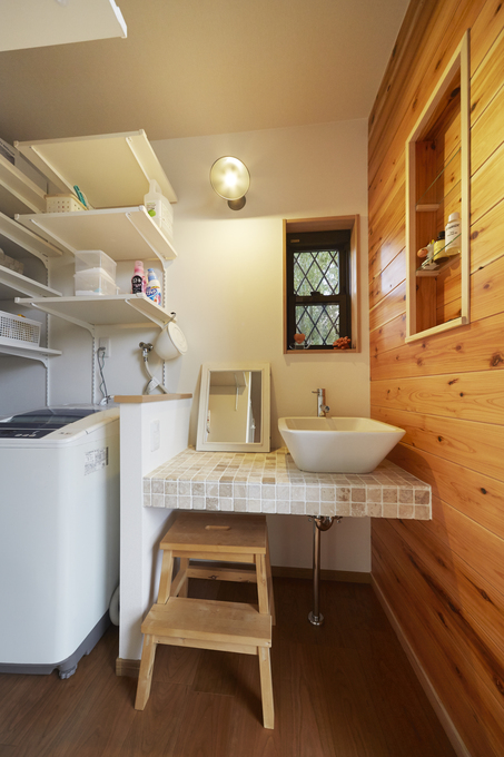 ...おしゃれなタイルが映えるフロートタイプの洗面化粧台デザインにこだわり、フロートタイプの洗面化粧台を設置しました。