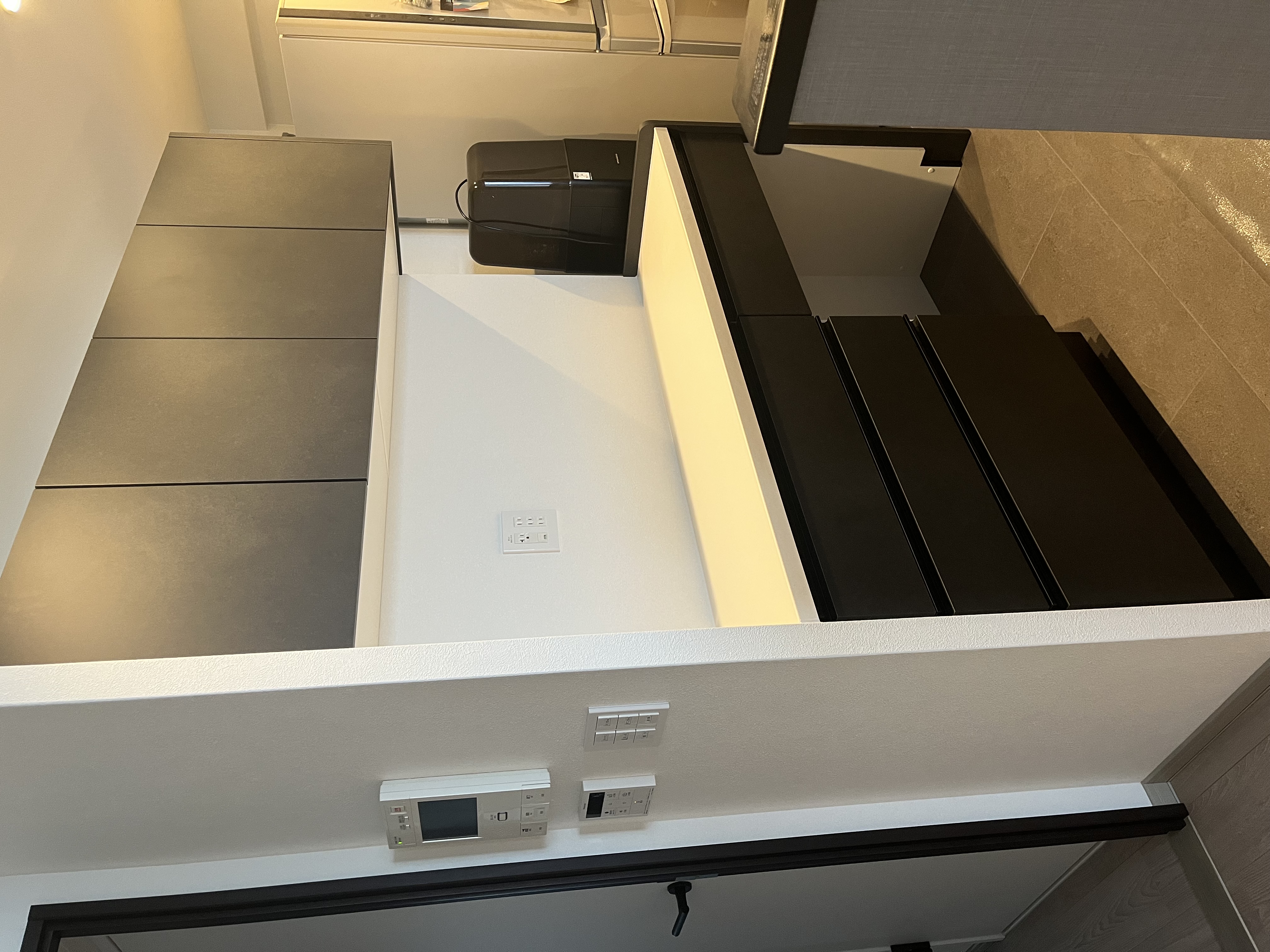 吊り戸棚の位置を使いやすいように天井から20センチ下げて設定するのはどうかとご提案いただきました。私の身長が低いことや見た目のスタイリッシュさも考慮し、20センチ下から設定するご提案でした。