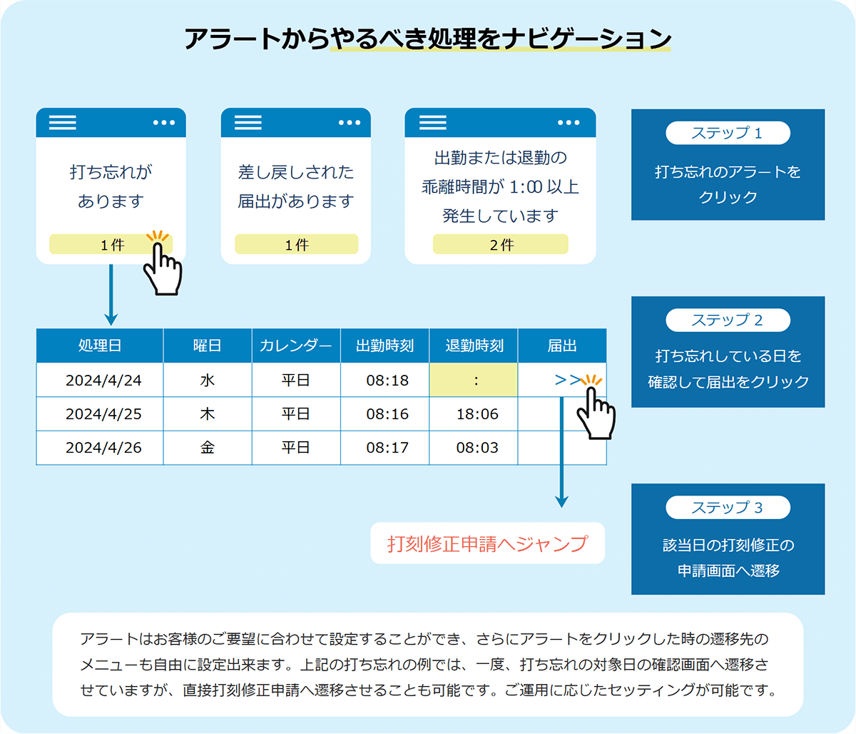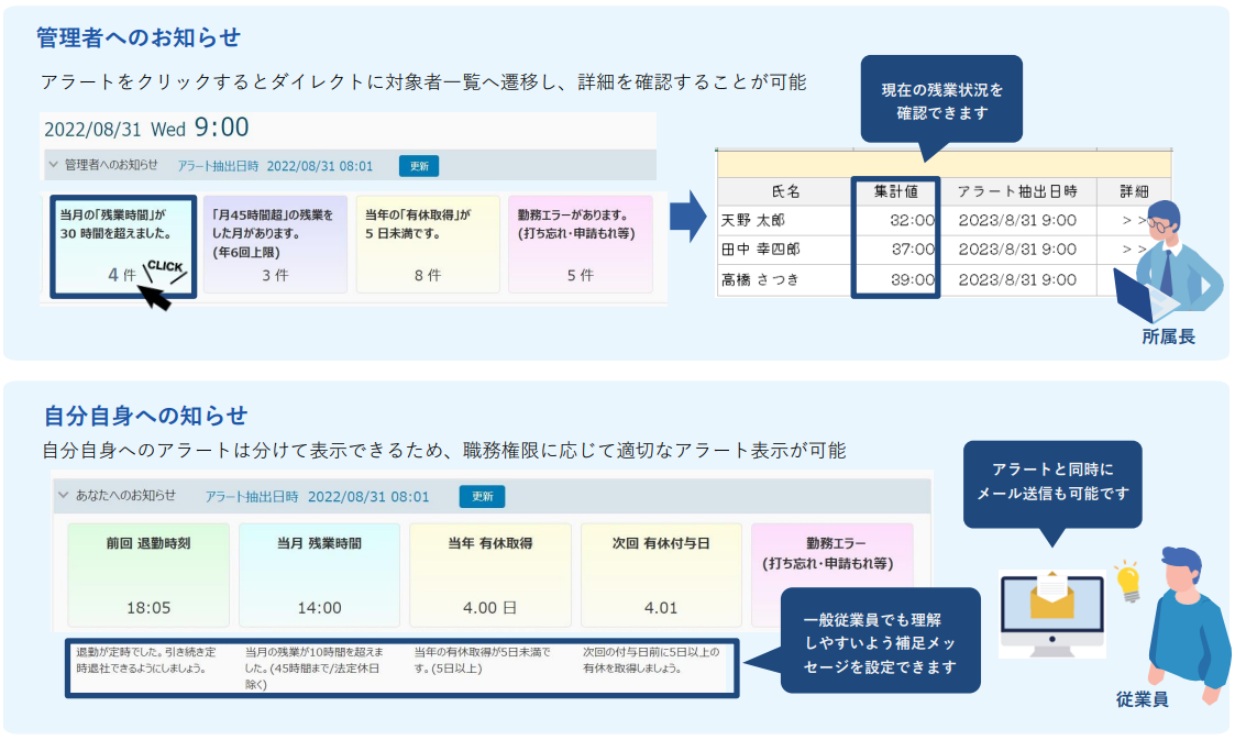 打ち忘れ、未申請/未承認業務、長時間労働の警告など・・・今やるべき処理、確認すべき内容はシステムのTOP画面に表示されるアラートがお知らせ。アラートに従って処理を行っていくことで迷うことなく効率的に業務を完結させることができます。自分自身へのお知らせアラートと、管理者として部下のデータも含めたアラートを分けて表示させることも可能です。さらにアラートの条件はSEが組み込みますので複雑な条件にも対応でき、お客様オリジナルのアラートを設定することが可能です。