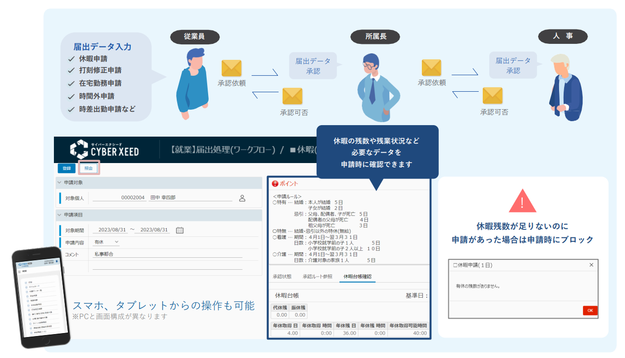 休暇申請や時間外申請など、届け出の申請機能も備えており、トップ画面から承認状況を確認できます。また、「届け出の操作方法がわからない」という従業員のために、申請画面に注意すべきポイントを表示することも可能。たとえば「有休休暇は前日までに申請する」「残業時間は1分単位で申請する」など、会社ごとのルールを記載できるほか、「休暇残数が足りないのに申請があった場合」などは、申請時にブロックされ、誤申請を防げます。打刻同様に、スマートフォンやタブレット端末から申請できるため、便利です。