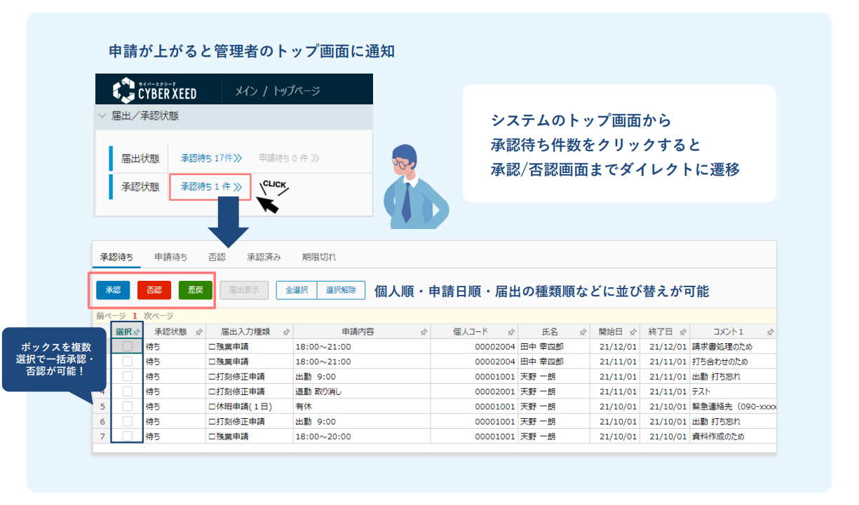 まずはトップ画面。申請されると承認者のトップ画面にアラートで通知され、その通知をクリックすると、承認・否認画面までダイレクトに遷移します。行うべき処理はシステムがナビゲートしてくれるため安心です。承認・否認画面では、申請された届け出を1件ずつ承認することも、複数まとめて承認することもできます。