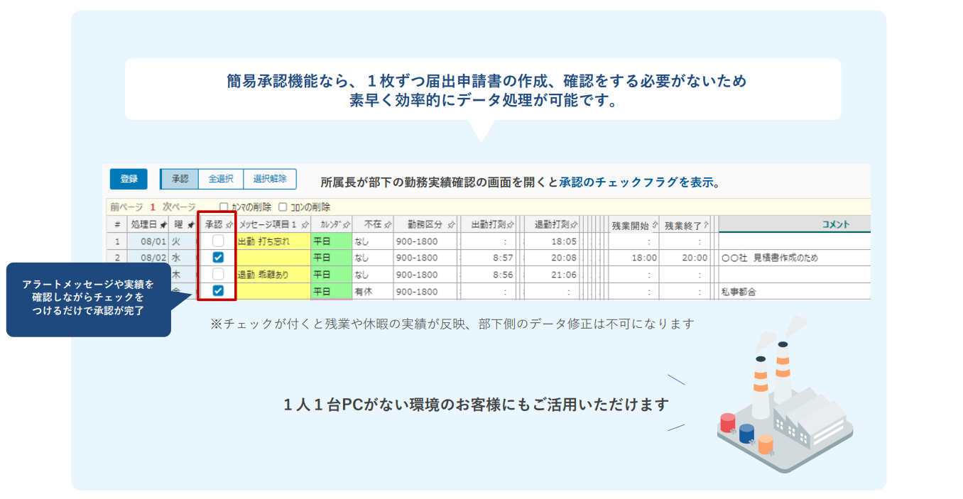 さらに、所属長が部下の勤務実績確認の画面を開くと承認のチェックフラグが表示される「簡易承認機能」も便利な仕様の1つ。アラートメッセージや実績を確認しながらチェックを付けるだけで承認が完了するため、1枚ずつ届け出申請書を確認することなく、効率的に承認業務を行えます。