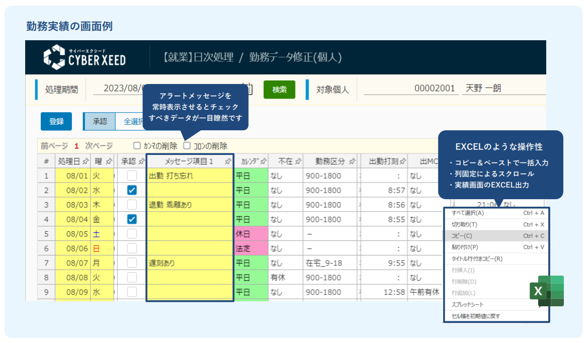 また、勤務実績の画面は「コピー&ペーストで一括入力」「列固定によるスクロール」など、Excelのような操作感で使えるのも魅力。迷いなく動かせる使い勝手の良さも、業務の効率化に一役買っています。