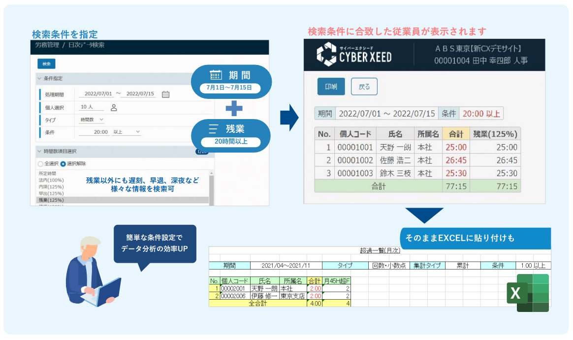 特に総務・人事など管理部門の担当者にとって使いやすいポイントは、多彩な検索機能です。月の途中や期の途中で条件を設定し、長時残業時間の上限を超過しそうな従業員や、有給休暇取得5日未満の従業員などを抽出することができます。対象となる従業員に注意喚起する際に便利なうえ、集計結果はExcelで出力できるため、加工して分析資料に活用することも可能です。