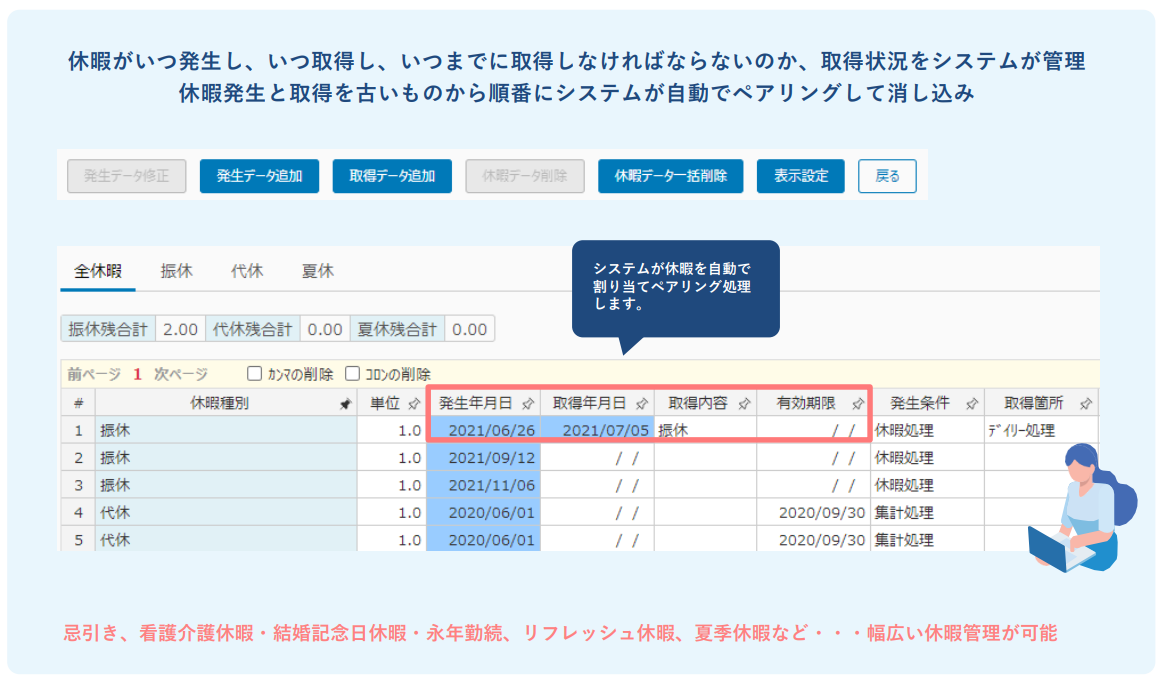 休暇がいつ発生し、いつ取得し、いつまでに取得しなければならないのかといった取得状況を管理する休暇ペアリング処理や、Excelに近い操作感でシフト表を作成できる機能も備えています。