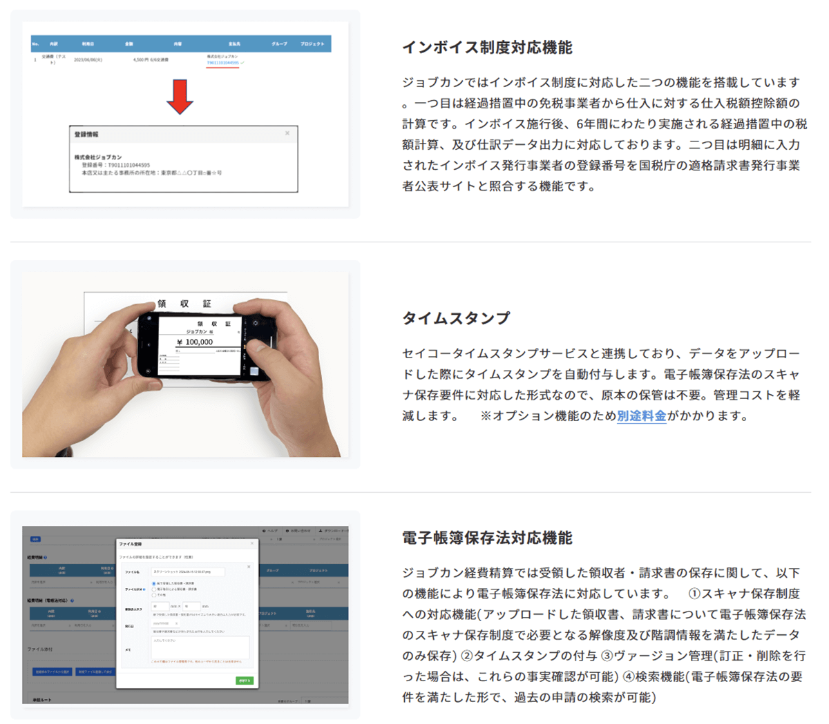 ジョブカン経費精算は、コンプライアンス面やセキュリティ面での安心感が高い点も魅力です。インボイス制度にしっかりと対応し、税額計算やインボイス発行事業者の登録番号照合をスムーズに行えます。電子帳簿保存法への対応では、領収書や請求書を電子データで保存し、タイムスタンプを自動付与します。ヴァージョン管理により、データ改ざんのリスクも低減できます。セキュリティ面では、IPアドレス制限や二要素認証によるログイン管理によって、不正アクセスや情報漏洩を防止します。